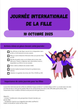 Par JEANNE BRUGNEAUX, publié le mardi 7 octobre 2025 15:12 - Mis à jour le mardi 7 octobre 2025 15:22Dress code violet / Vos voeux pour l'avenir des filles vers une production collective/Chaîne humaine (cour du lycée à la récréation de 10h) / Flyers d'information à l'infirmerie / Idées lecture pour réfléchir, échanger au CDI. On compte sur vous ! -
